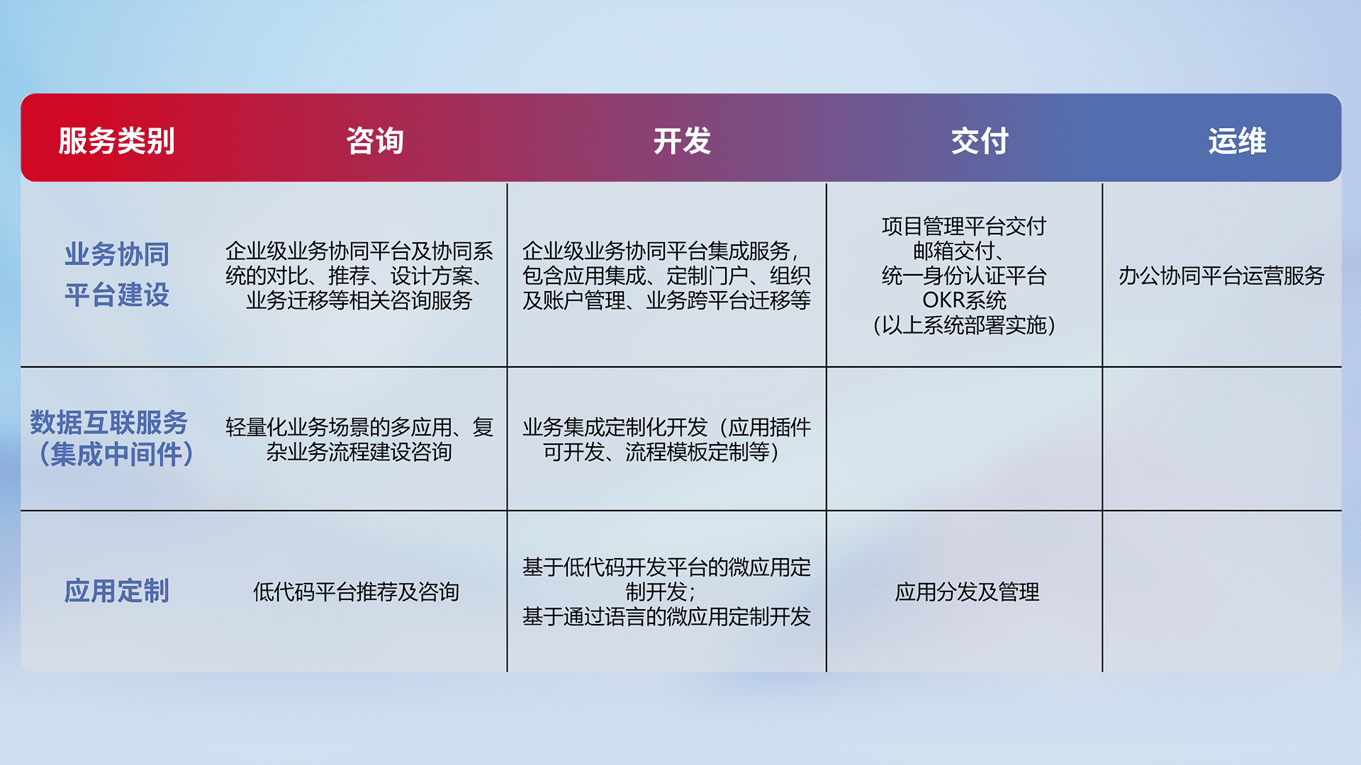 针对钉钉、、企微、、、、IDaas等平台级产品提供产品的规划、、、方案、、交付、、、定制化开发等服务,,实现如统一协同办公、、、、智能客户服务、、、混合会议管理、、、智能数据查询、、、等业务场景,,实现数字化转型。。