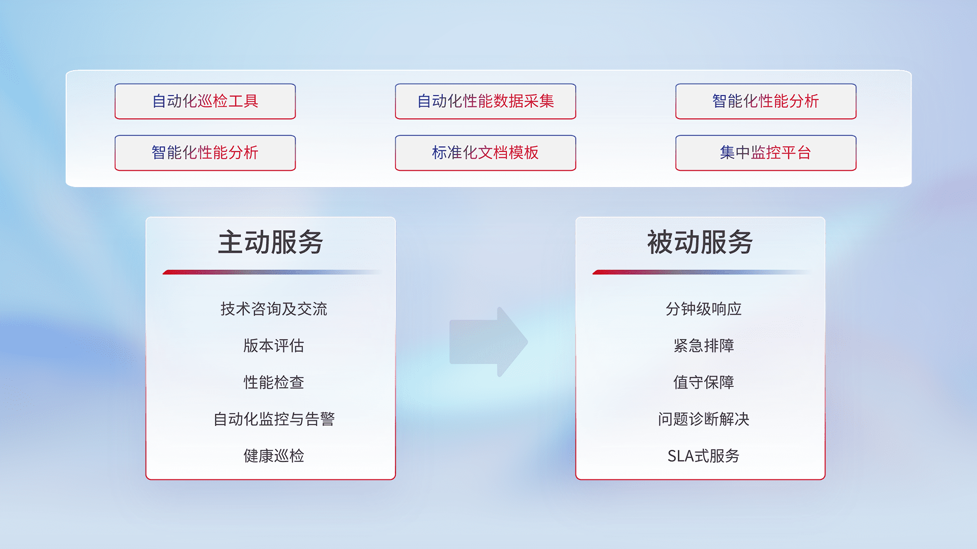 智能化工具和标准化文档,,,保障服务质量,,,,提供主动服务(包含技术咨询、、版本评估、、、、性能检查、、自动化监控与告警、、健康巡检)和被动服务包含(分钟级响应、、、、紧急排障、、、值守保障、、、问题诊断解决、、、SLA服务)。。