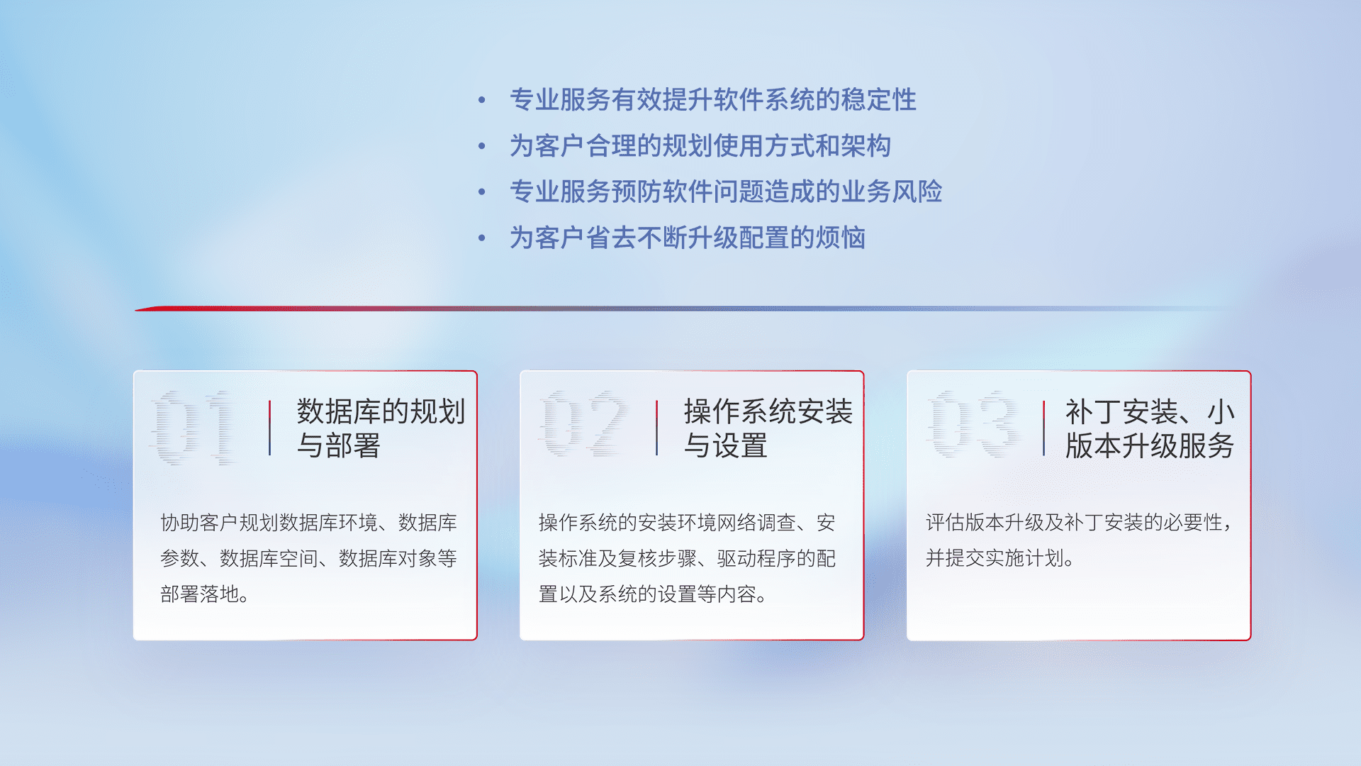 为客户提供软件规模升级、、、快速部署、、、按需配置的专业服务,,从数据库的规划与部署到操作系统的安装与设置,,,,再到补丁安装和小版本升级提供支持。。